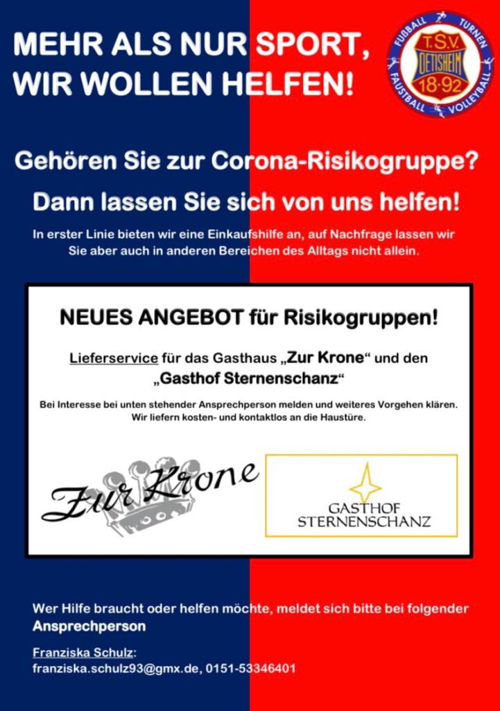 Lieferservice für Bestellungen der Ötisheimer Gasthöfe Zur Krone und Sternenschanz für Risikogruppen