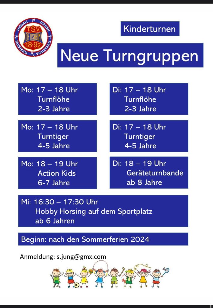 Neue Zeiten und Gruppen! Eine Anmeldung muss für jede Teilnehmer/in erfolgen! Bitte meldet euch also an für unsere neue Kinderturnstunden! Wir freuen uns auf euch!